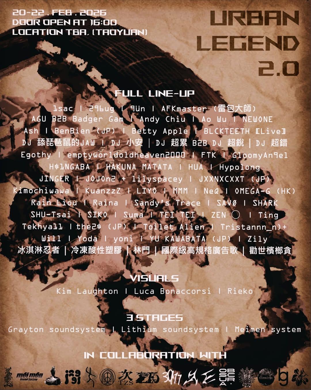 Urban Legend 2.0 is headed to a vast abandoned complex in Taoyuan. Spanning three days and three stages, the festival delivers a staggering 46 hours of hardcore, experimental, breaks, techno, funk, psy, and more across the Grayton, Lithium, and Meimen soundsystems and stages. This year’s expansive line-up features boundary-pushing acts such as BenBien, JXXNXCXXT, YU KAWABATA, OMEGA-G, BLCKTEETH (Live), Betty Apple, and a special b2b set from AGU and Badger Gam, alongside dozens of rising regional selectors and live performers. Set within raw industrial ruins enhanced by striking visuals from Kim Laughton and Luca Bonaccorsi, Urban Legend 2.0 promises an intense, multi-sensory rave experience in the garden city.