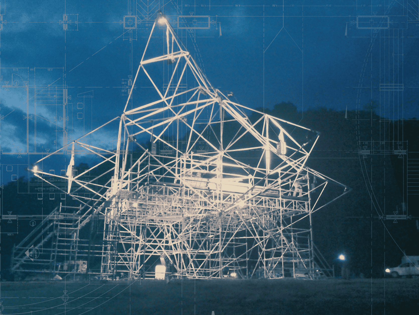 ‘Small Mountain Music Festival’ came from a complaint at ‘Overhead Nightclub’: artists couldn’t see the audience’s hands, so clapping wasn’t possible. The solution was extreme: the stage became a peeping pyramid.