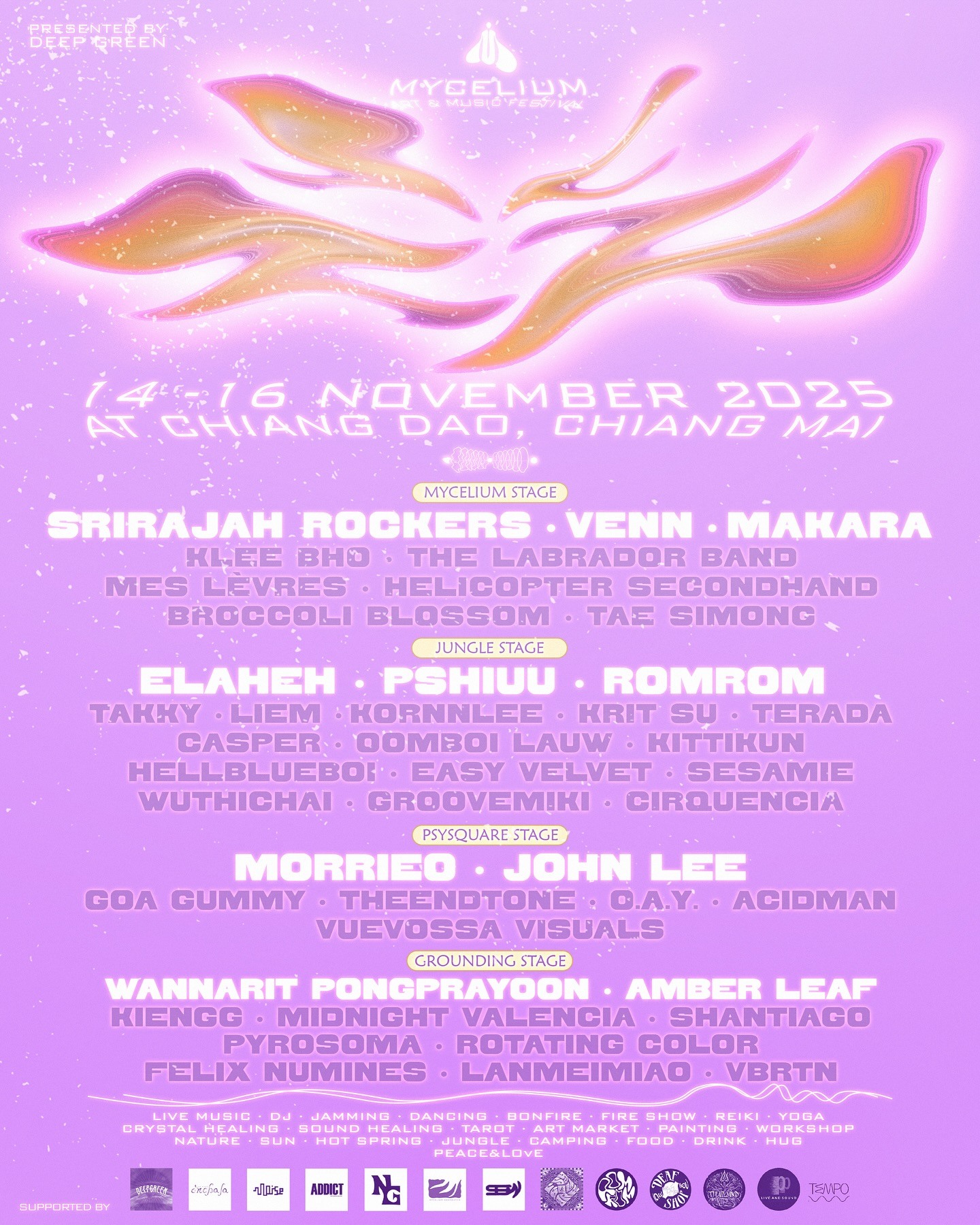 Mycelium Art & Music Festival returns with four stages showcasing a diverse mix of live and electronic music in a forest setting. The Mycelium Stage aka main stage features live music acts like Srirajah Rockers, Makara, and Mes Lèvres, while the Jungle Stage highlights electronic talents such as Elaheh, RomRom, DJ Fehlt, and Oomboi Lauw. The Psysquare Stage brings high-energy psytrance from artists like Morrieo, Goa Gummy, and Acidman, and the Grounding Stage offers ambient and experimental sets from Amber Leaf, Kiengg, and VBRTN, rounding out a weekend of immersive sound and creative exploration in Chiang Mai.