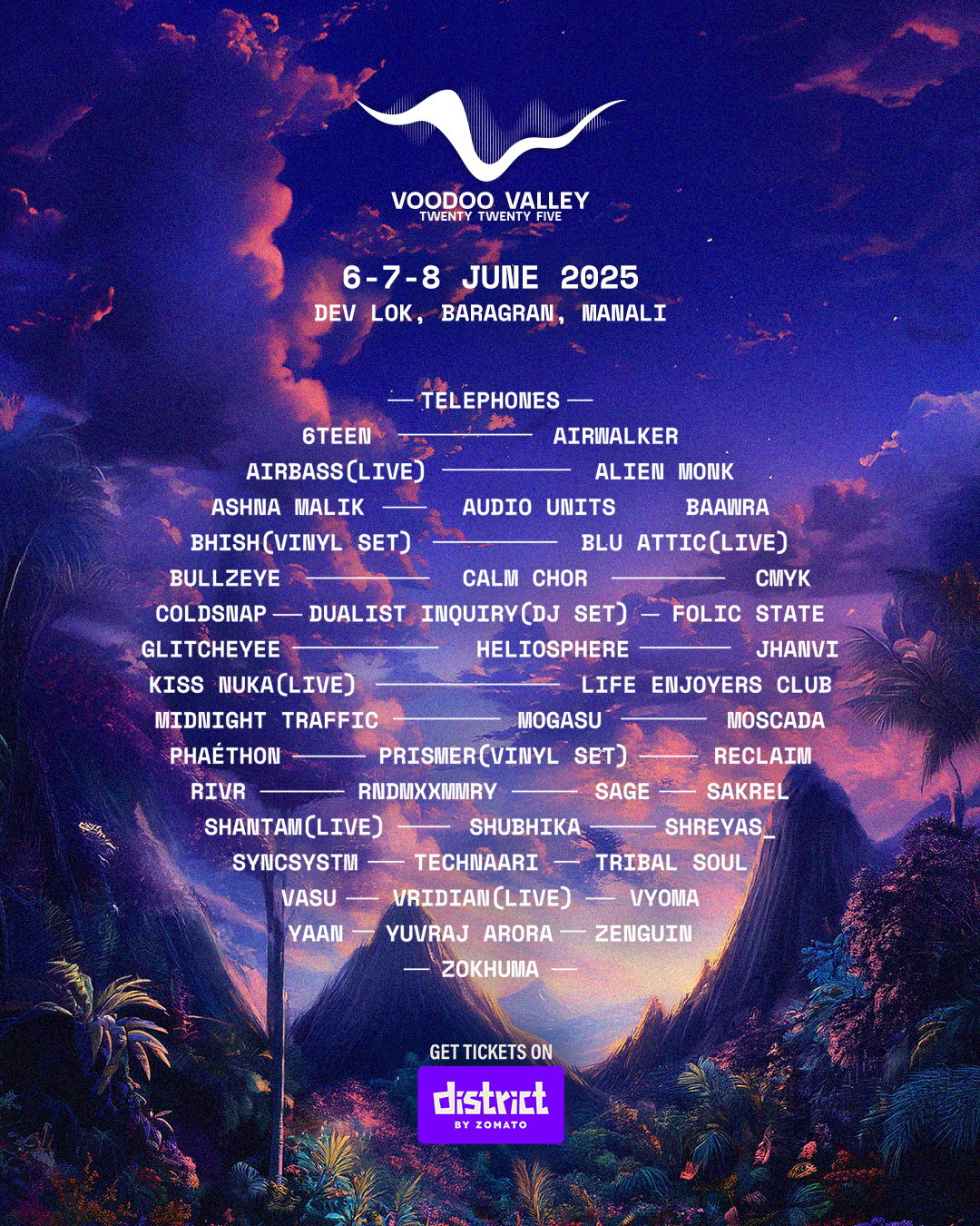 Voodoo Valley returns June 6–8, 2025, transforming Dev Lok, Manali, into a high-altitude haven for music lovers with three stages—one a natural amphitheatre—and a stacked line-up including Telephones, Audio Units, Kiss Nuka, Dualist Inquiry, Bullzeye, Calm Chor, and more. Curated by Dancedelic, the festival is more than just beats—expect immersive art zones, fire dance shows, and a wellness retreat featuring tai chi, sound healing, and local culinary rituals. Set deep in the Himalayan deodar forests, Voodoo Valley offers a multisensory escape blending music, culture, and altitude—complete with paragliding and slackline stunts at 8,000 feet.