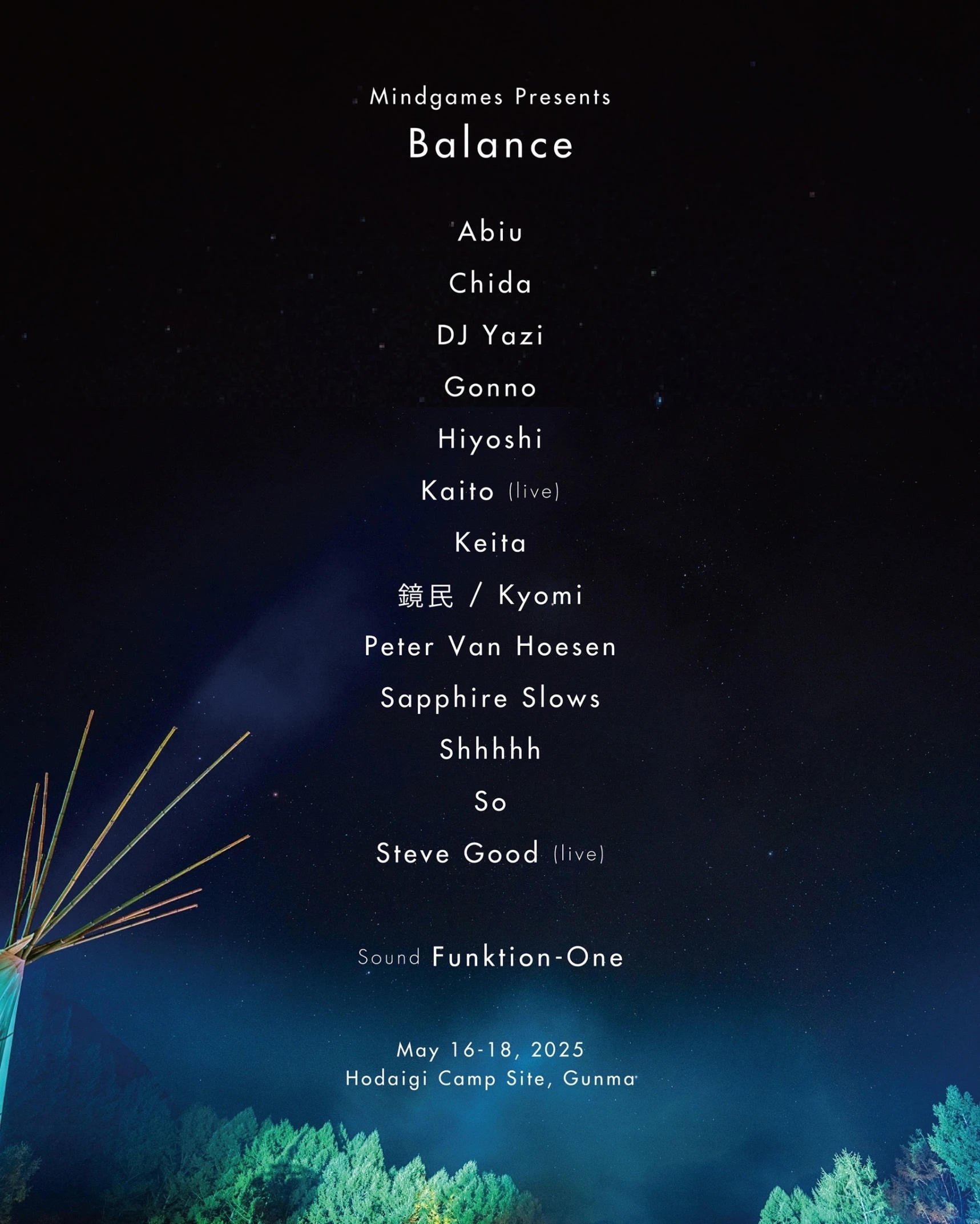 After a two-year breather, Balance by Mindgames is back. Think of it as Labyrinth’s younger sibling: same DNA, smaller dancefloor, and a deeper dive into Japan’s local talent pool. With three full days of sonic exploration powered by next-gen Funktion-One Evo speakers, this edition features Peter Van Hoesen, Sapphire Slows, DJ Yazi, Chida, and Gonno plus live sets from Steve Good and Kaito, all wrapped in the warm, intimate glow of a festival that feels more like a secret gathering of old friends.