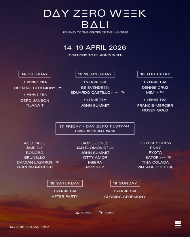 Day Zero will debut in Bali with a week of events from April 14-19, 2026, including a sunset-to-sunrise session at GWK Cultural Park on April 17.