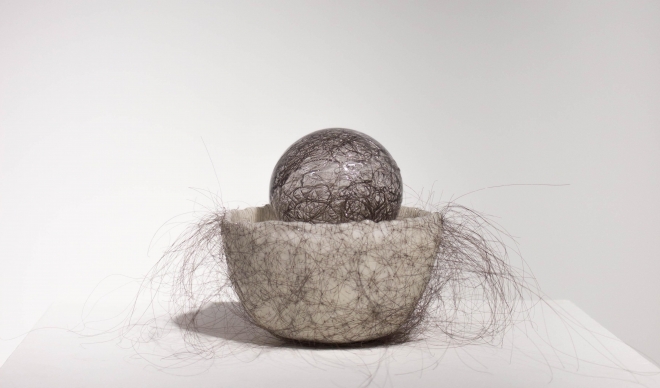 The booth centres on an interactive floor installation that visitors can walk across, experiencing shifting textures underfoot. Alongside it is a wall work made from broken eggshells sewn together with the artist’s hair, continuing Sikdar’s exploration of fragility and resilience.