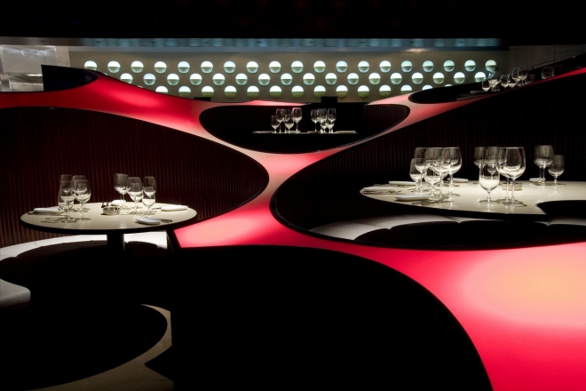 Circular mahogany-finished booths surrounded a central stage, complemented by stepped flooring, acoustic treatment, and colour-shifting lighting that created an intimate and immersive environment.