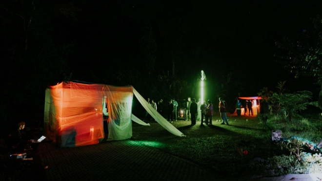 Set at Tibuan Waterfall in Buleleng, Bali, the twenty-hour event runs from noon to dawn in a forest clearing surrounded by river and mist.