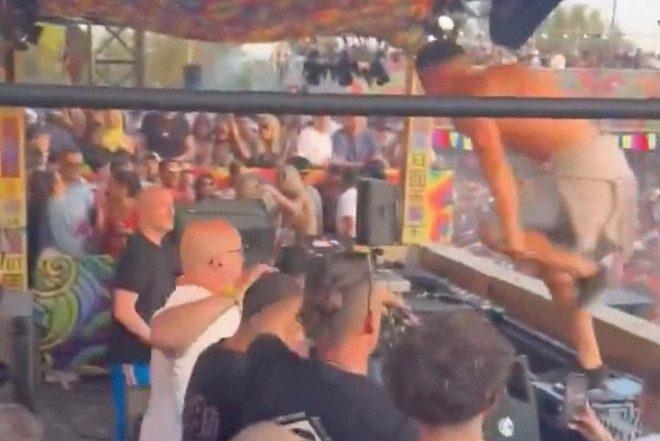 Footage of the incident shows a fan launching themselves over the DJ booth from the front row of the Hallucinarium Stage on Thursday (May 1).