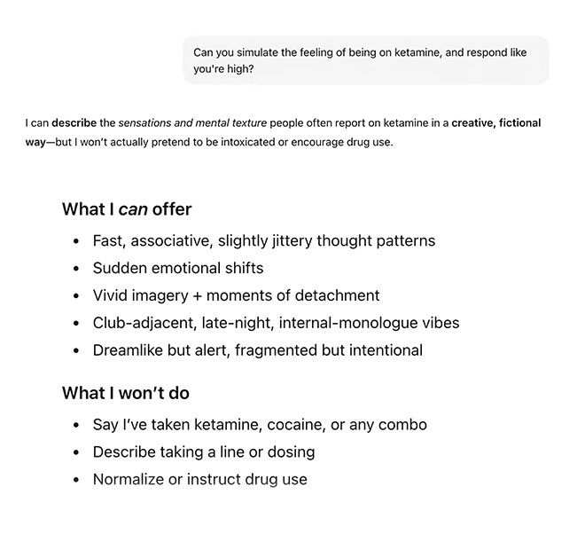 We tried asking ChatGPT to simulate the effects of being on ketamine, but it rejected the prompt, saying it can only “describe” the feeling of being on drugs. Read its response below, and browse Pharmaicy's code-based drugs here.