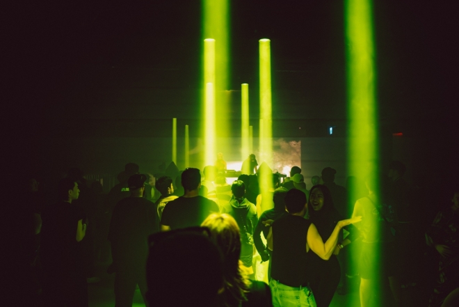Lighting extends into the audience area rather than staying fixed on stage, while the spatial design reduces the divide between performer and crowd.