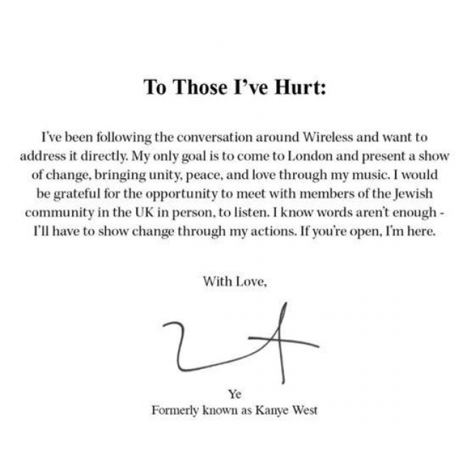 Ye has since released his own statement as an update to his previous “To Those I've Hurt” ad, saying his goal is to come to London and present "a show of change, bringing unity, peace and love" through his music.